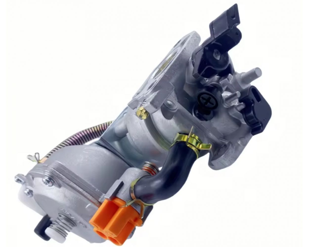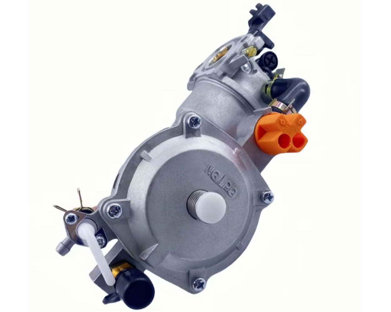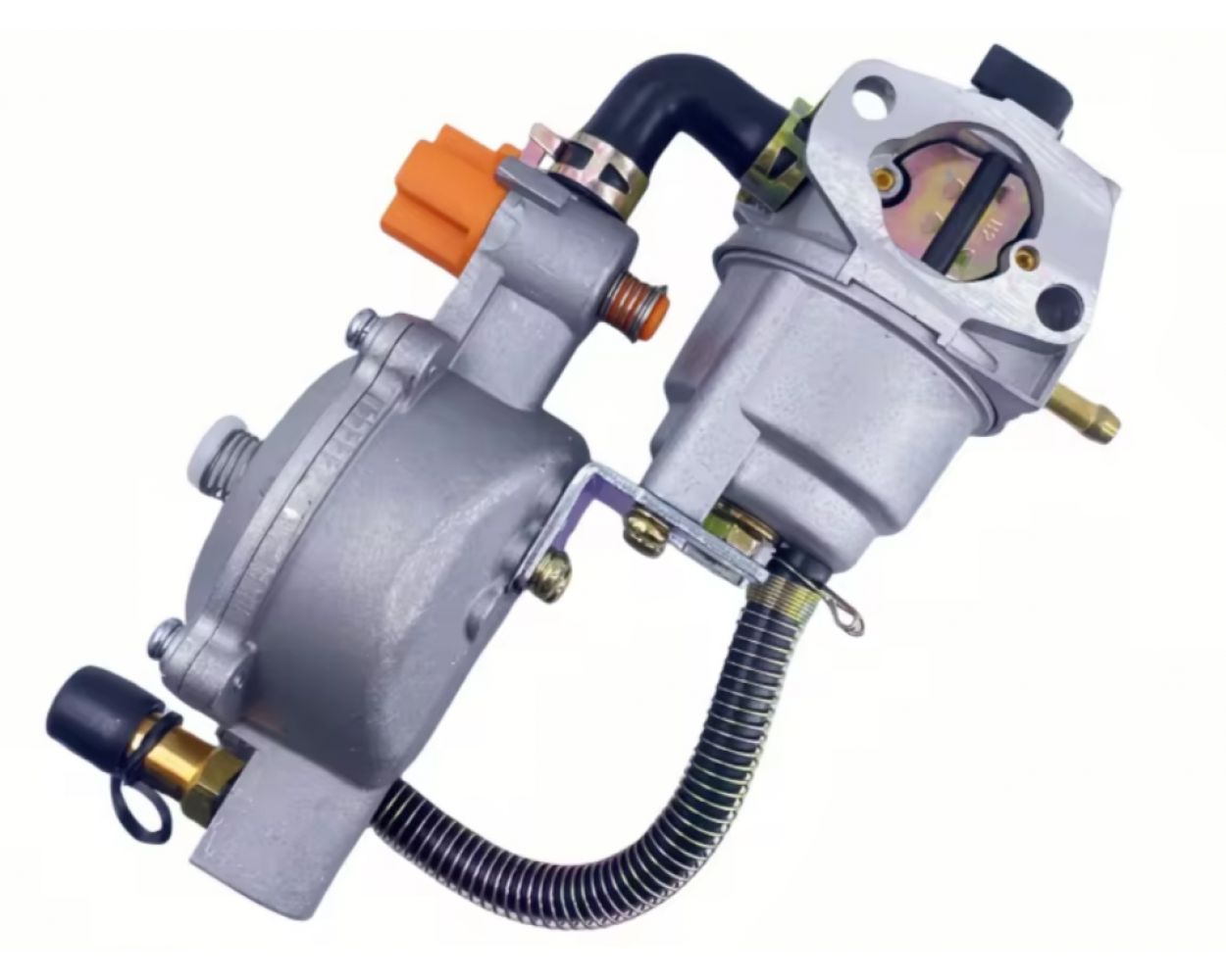 Карбюратор с газовым редуктором для генератора, на котором установлен двигатель. Благодаря этому устройству, вы сможете существенно сократить затраты на топливо. Установив карбюратор с газовым редуктором на генератор, вы сможете стационарно запитать его от магистральной трубы, подведенной к дому, или от балона. Таким образом генератор на газе будет работать длительное время. На редукторе есть переключатель красного цвета.