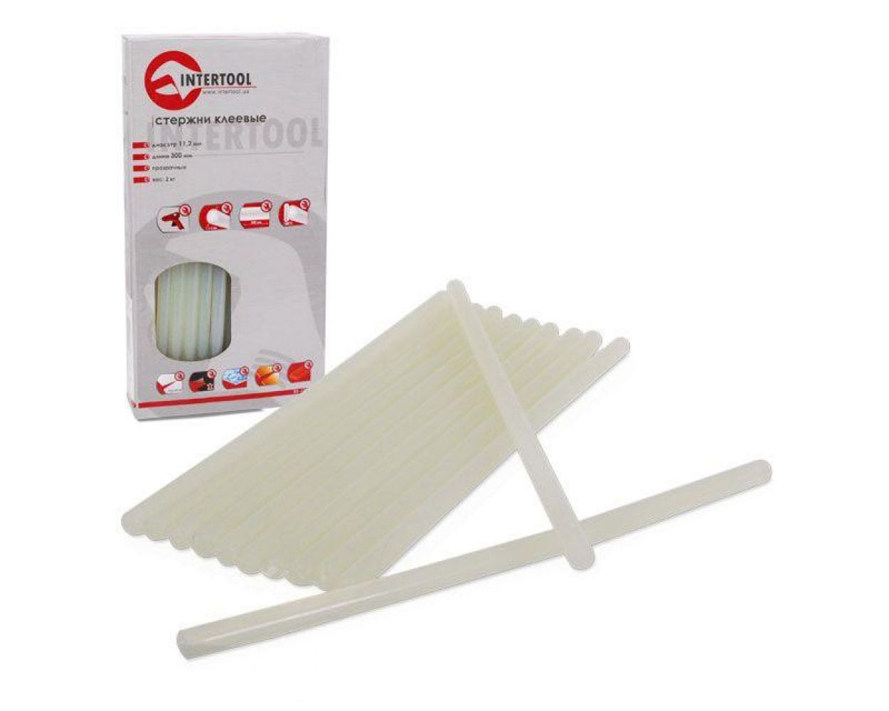 Теги: Комплект прозрачных клеевых стержней 11, 2 мм x 300 мм, уп. 2 кг INTERTOOL, RT-1024
